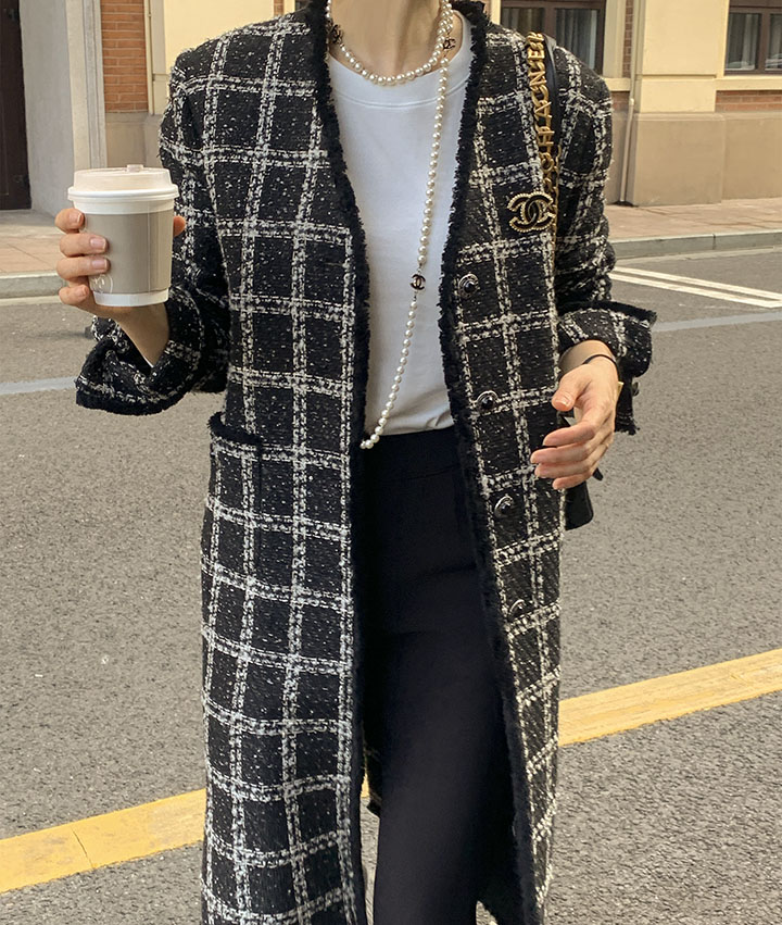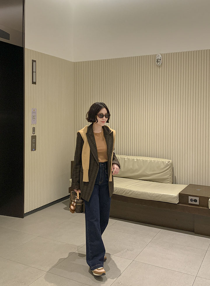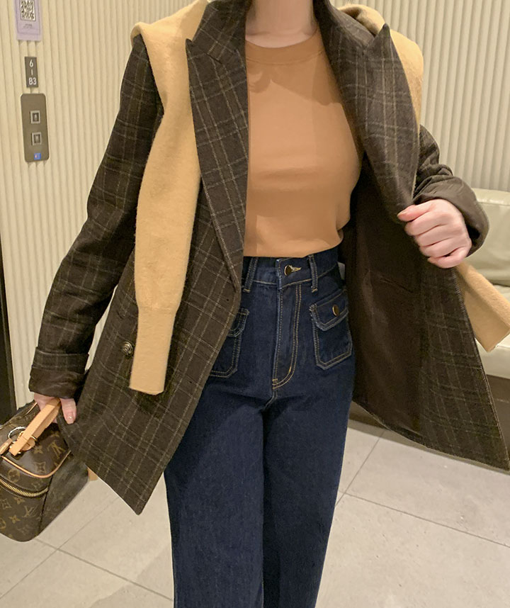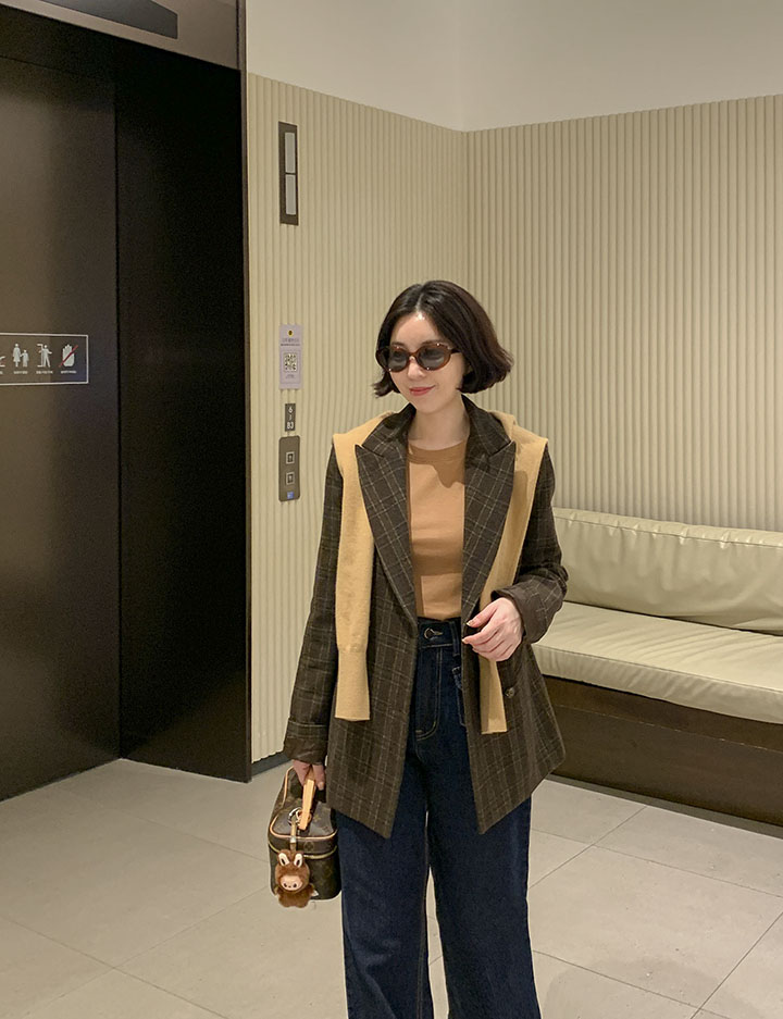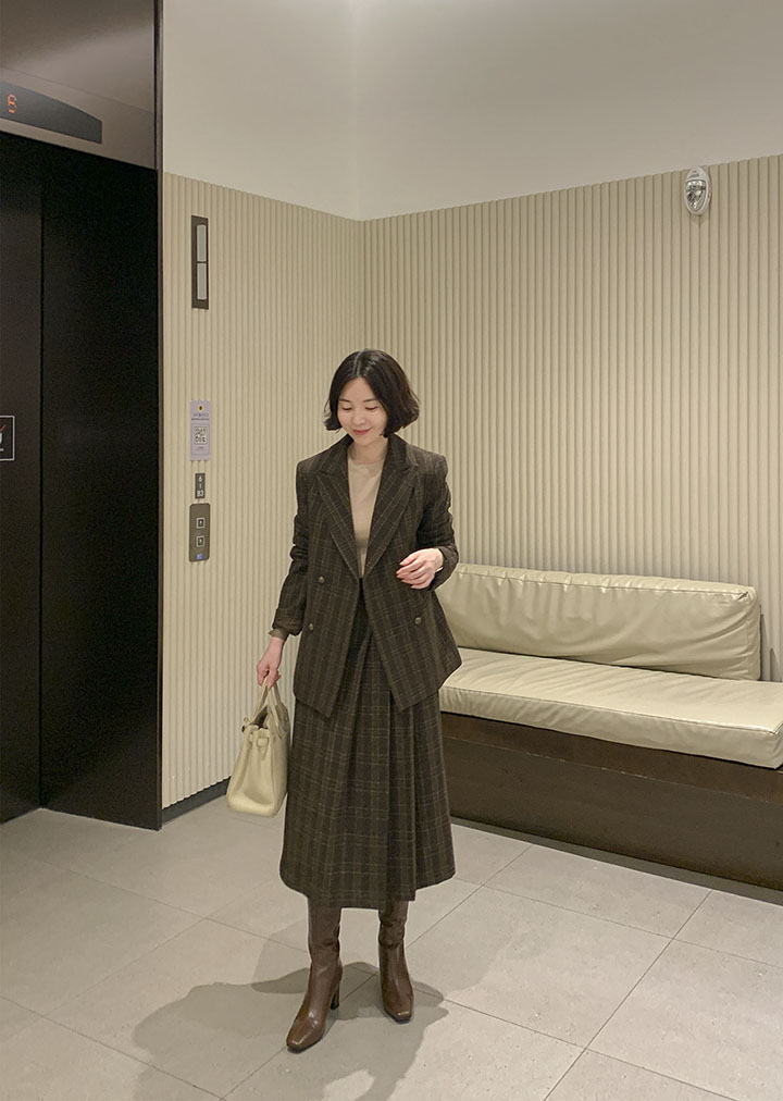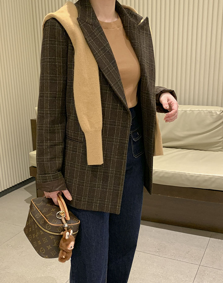 チェックとソリッドのソフィスティケイト調和、チェックウールジャケットクラシックデザインでさらに女性らしく