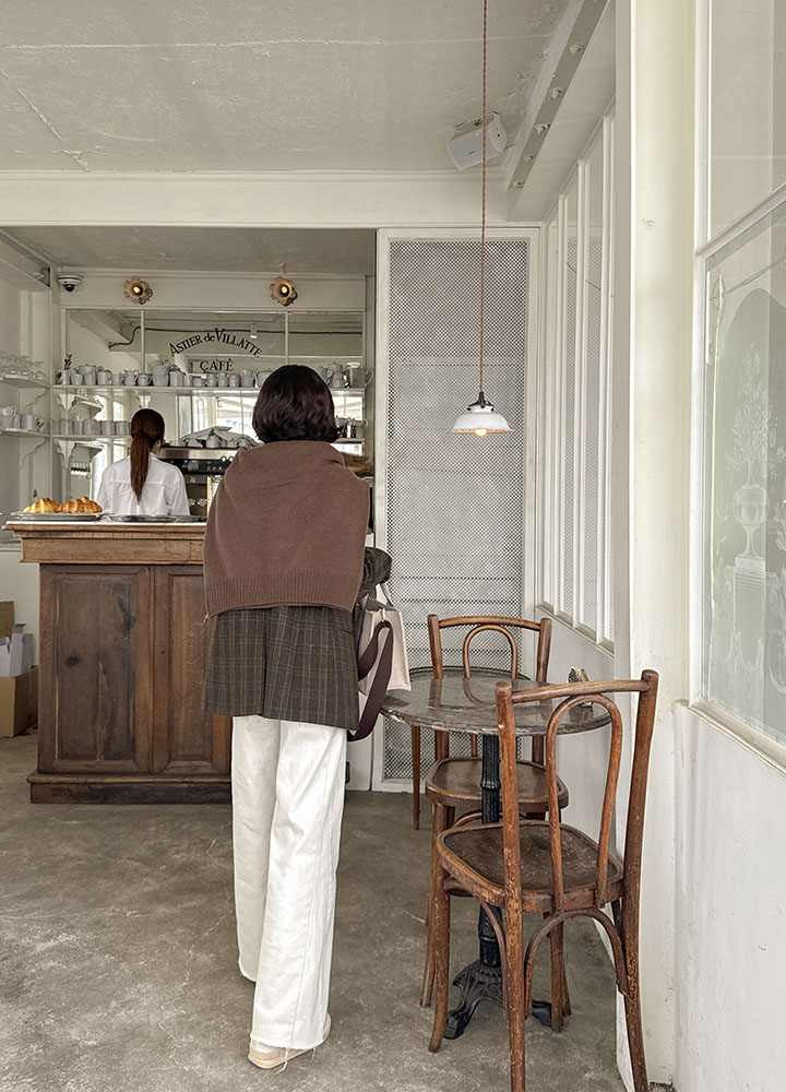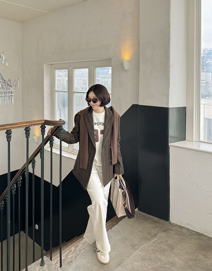 チェックとソリッドのソフィスティケイト調和、チェックウールジャケットクラシックデザインでさらに女性らしく