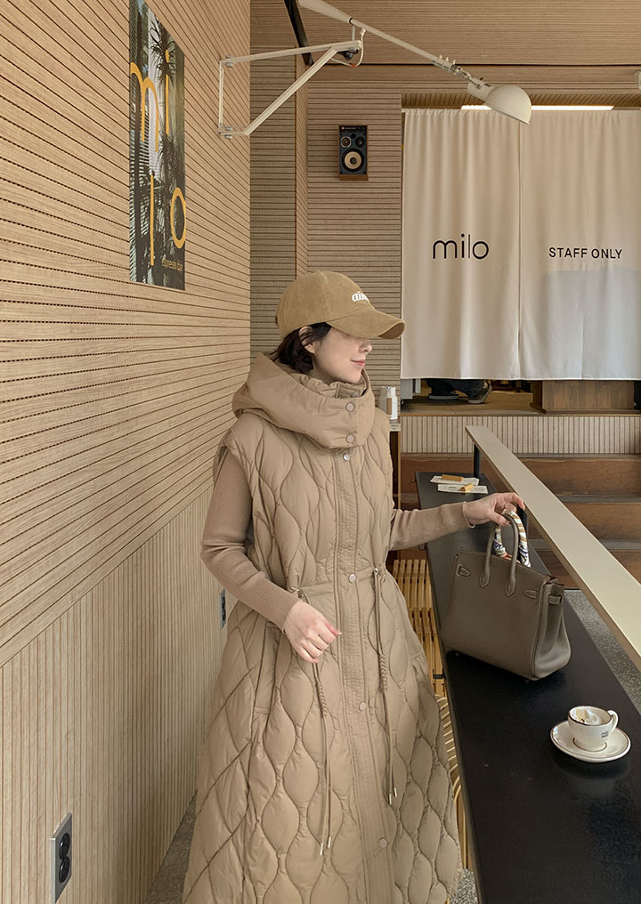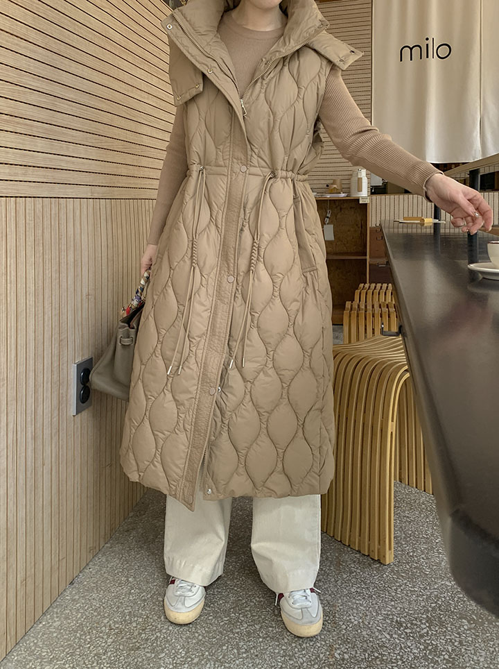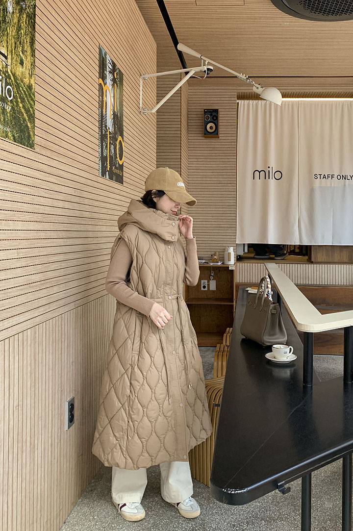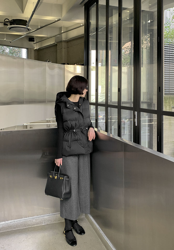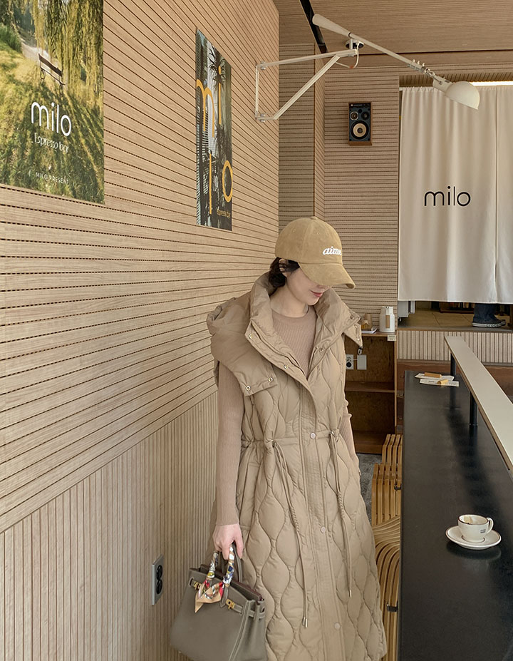 首まで暖かく包み込むハイネックロングバディングベストソフィスティケイトシルエットでどこでもウェアラブルに!