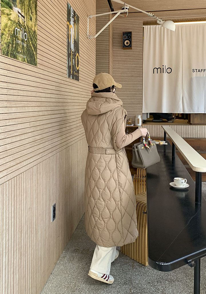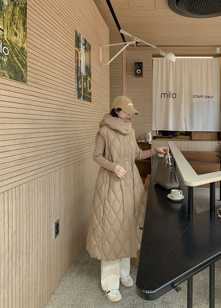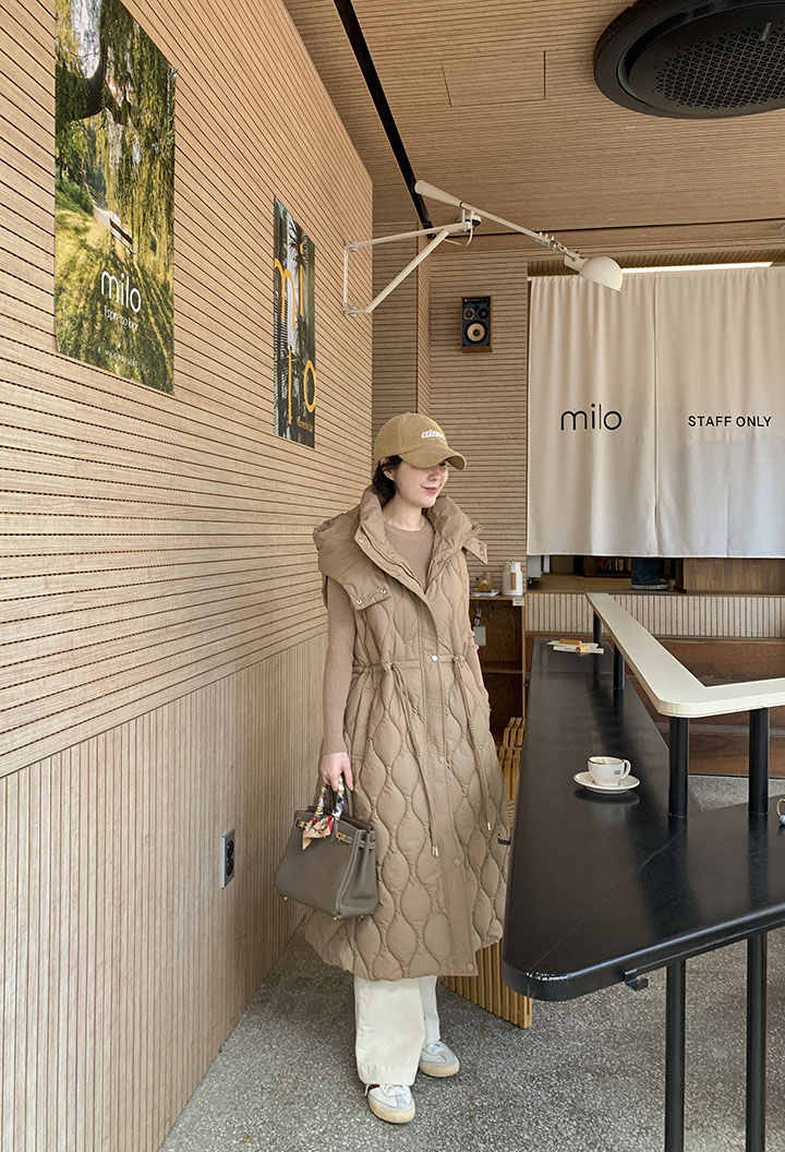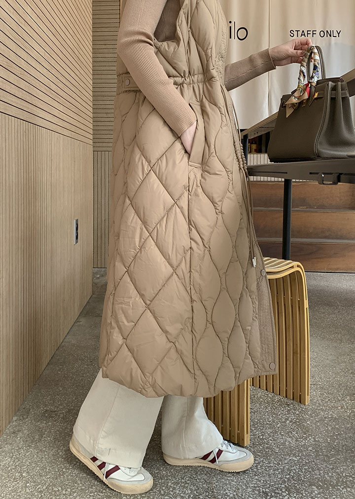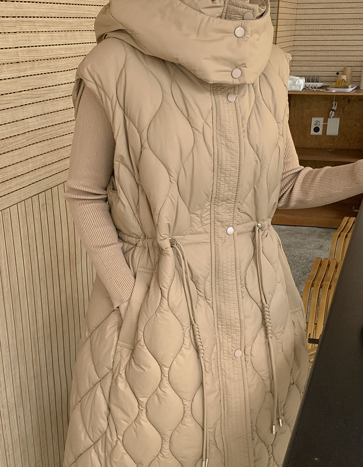 首まで暖かく包み込むハイネックロングバディングベストソフィスティケイトシルエットでどこでもウェアラブルに!