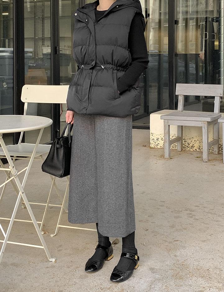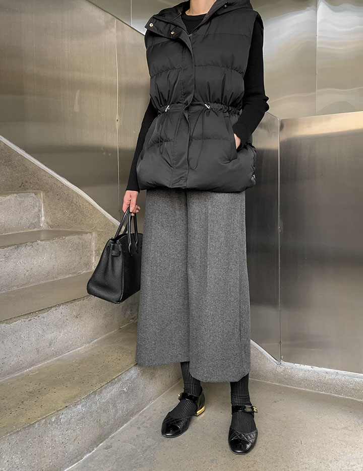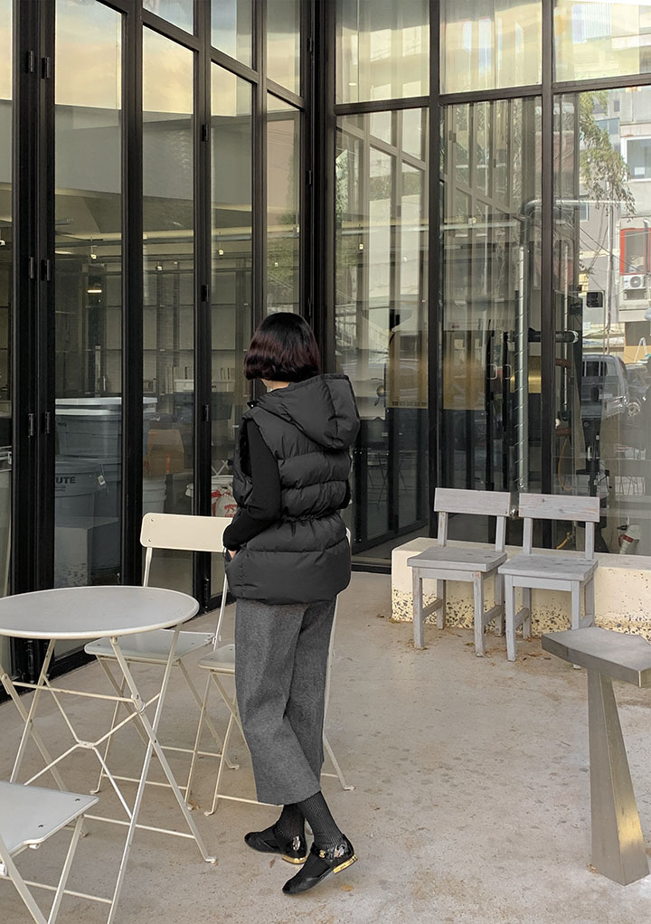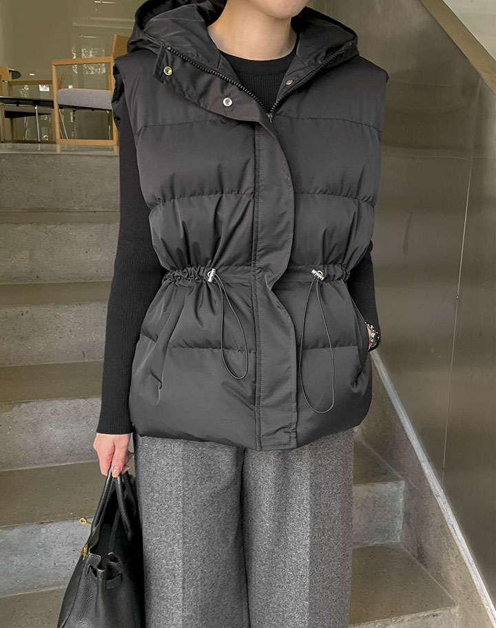 着る瞬間ふわふわが感じられるフードバディングベストウエストストリングでソフィスティケイトアウトフィットがきれいですよ