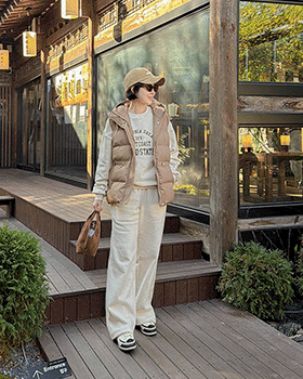 着る瞬間ふわふわが感じられるフードバディングベストウエストストリングでソフィスティケイトアウトフィットがきれいですよ